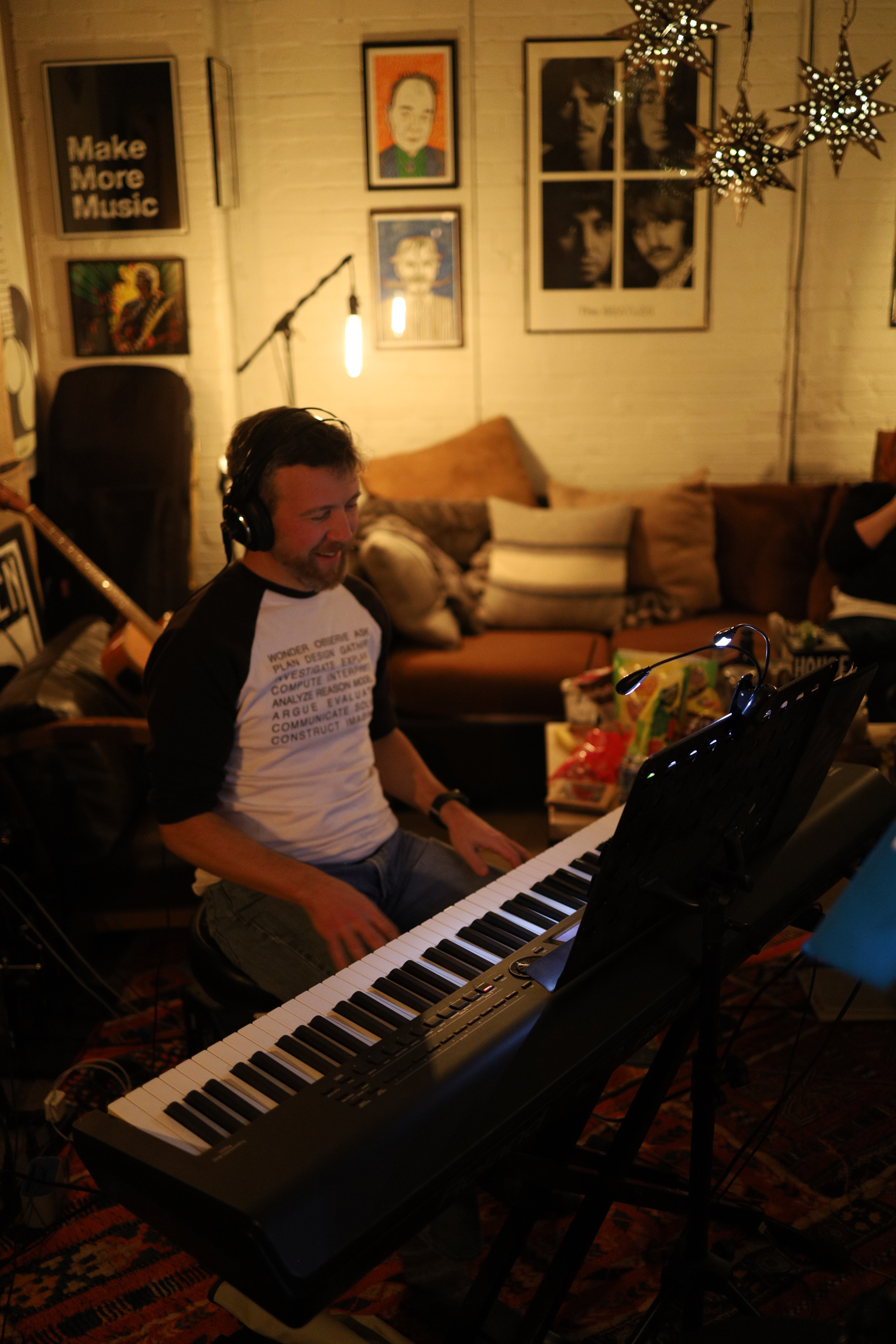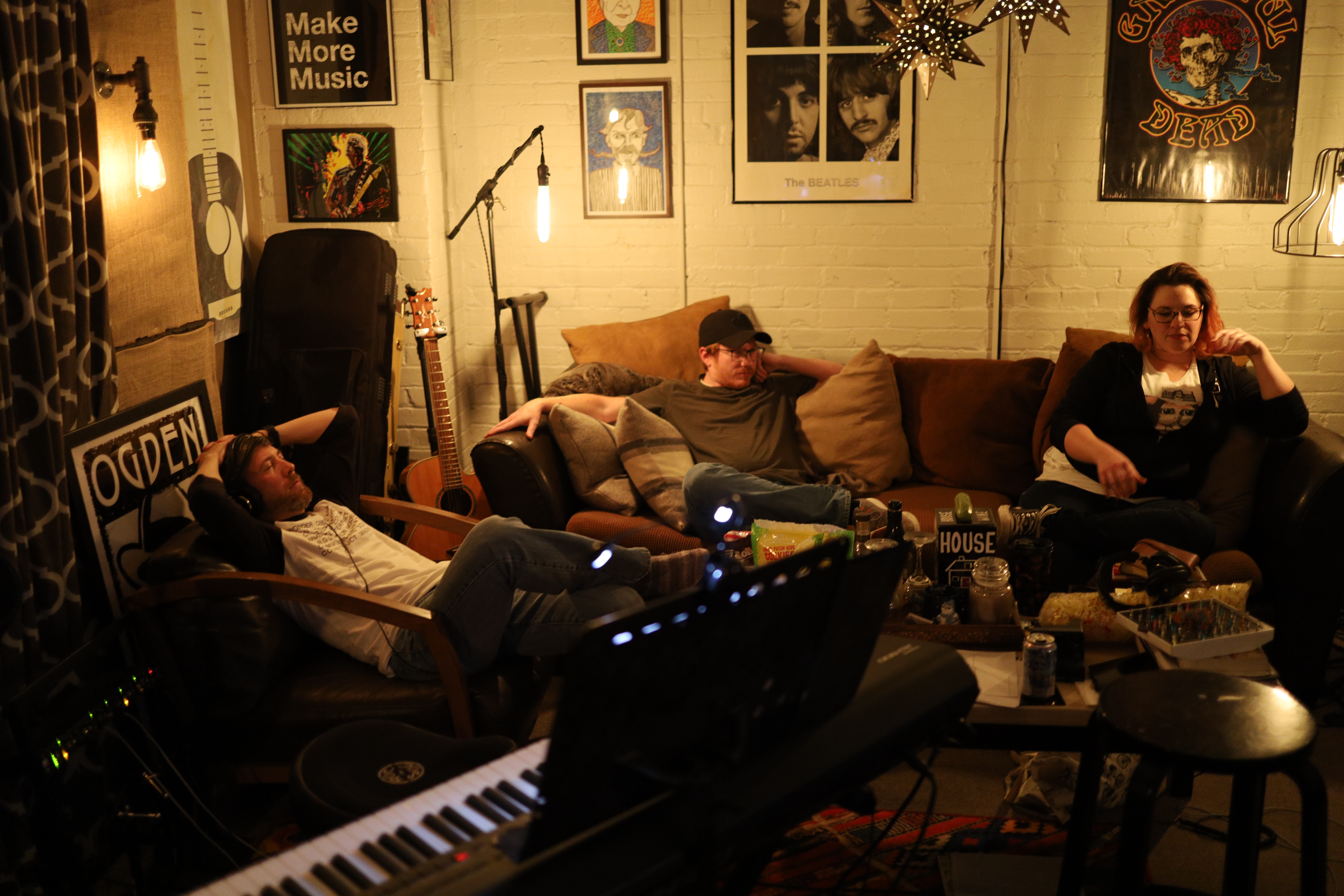 Listening to tracks. Tim’s here too, but he’s behind the camera.