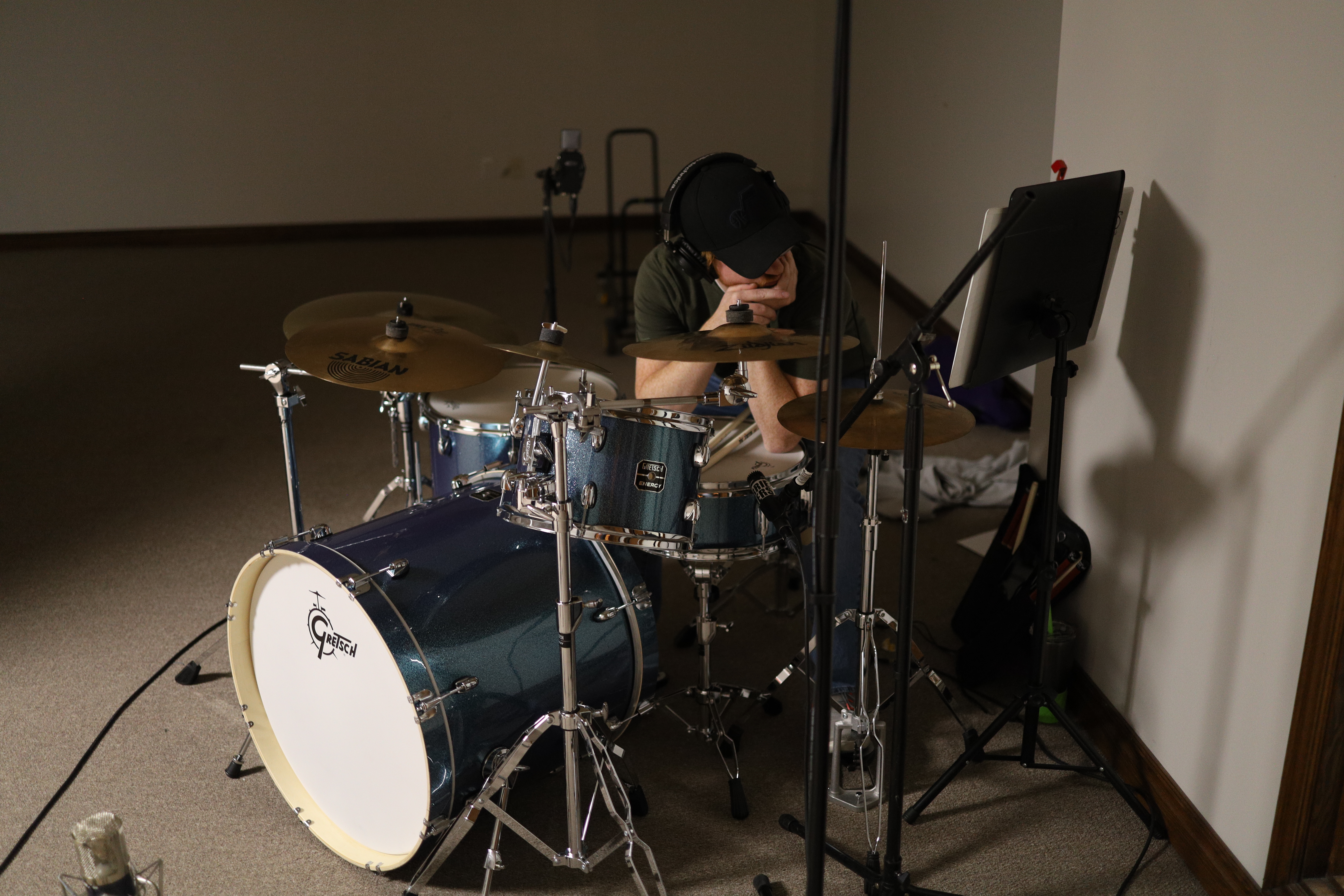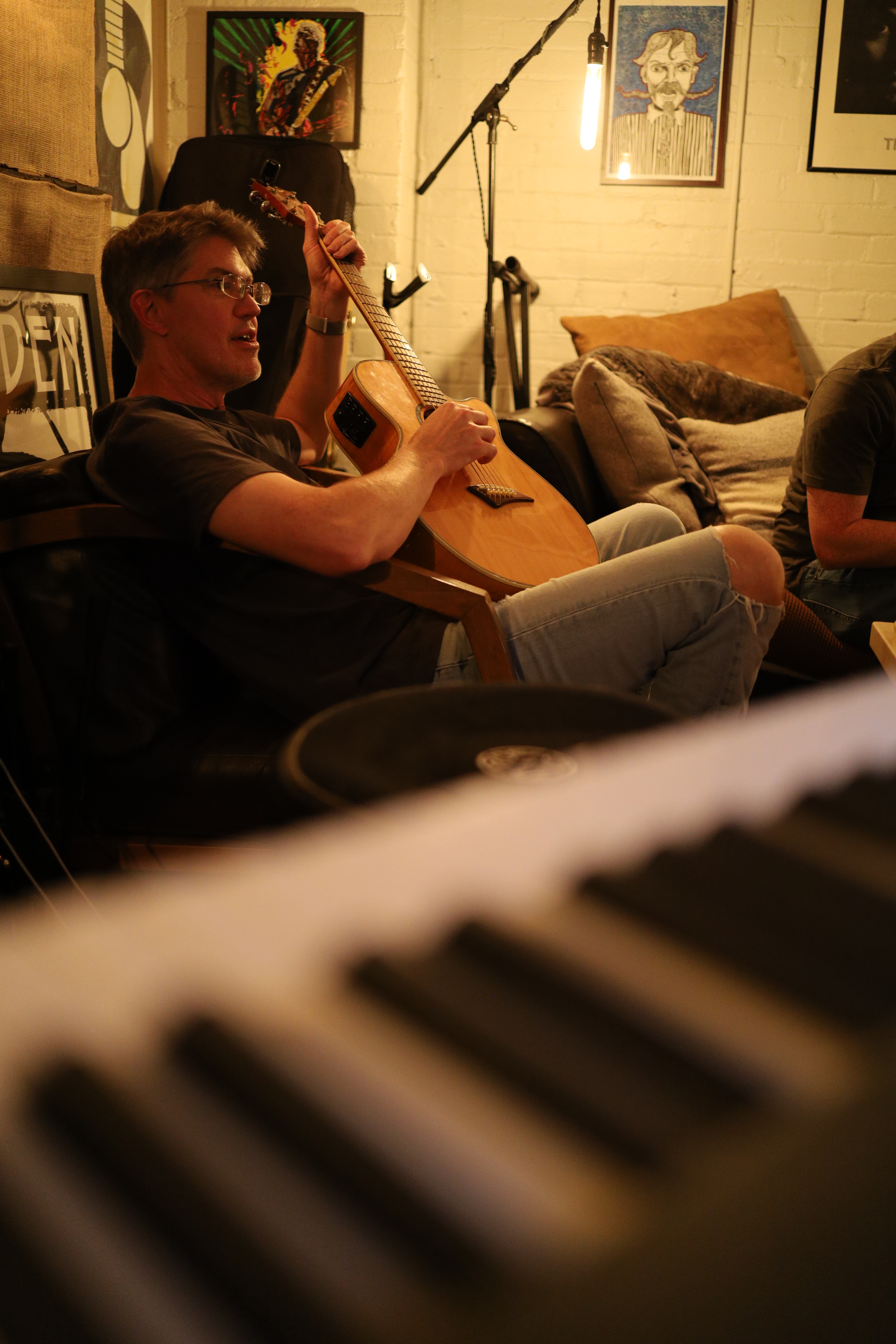 Tim picks up one of the many instruments around the studio in between our takes.