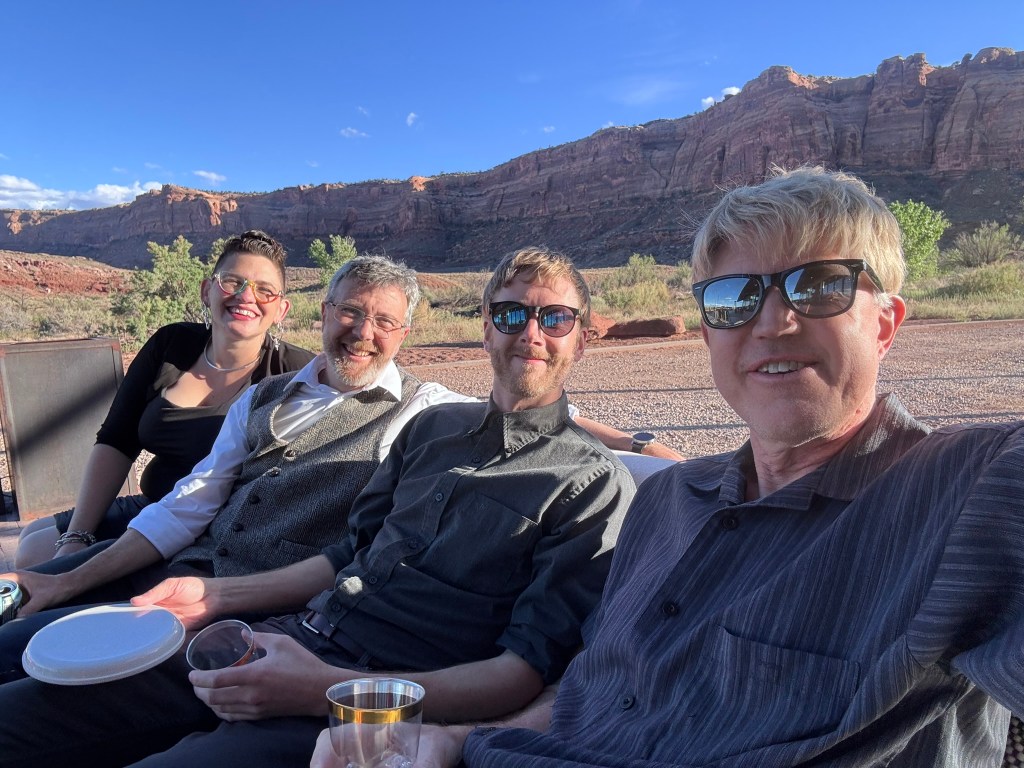 This was a good chance to demonstrate that we could roll with whatever, playing under cover to protect ourselves from thunderstorms and wind gusts. Lovely people gathered together to roll with whatever the desert landscape dished out. It was a real joy to celebrate K & D, their families and friends. We got to watch them all gather together on the dance patio, arm in arm in a giant circle, singing and swaying along with our music.