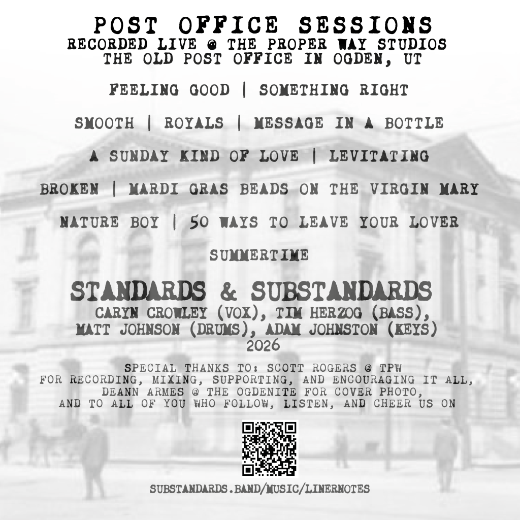 Post Office Sessions is so named for its production in the basement of the Old Post Office building in Ogden, Utah, an iconic and historic cornerstone of the band’s hometown. It has housed plenty of notable associations, the most important of which is the underground residence of The Proper Way Studios. This is where we were able to record out in the open, monitors bleeding our sounds into the room (rather than headphones) so we could hear ourselves just like we do in our most comfortable live settings. We leaned in even more by inviting people into the studio to hang out and cheer us on or, sometimes, stay absolutely quiet as we’d let a song hover in stillness as we finished. They were also gracious enough to allow us some false starts and a few extra takes; but they also got to witness single takes and moments that just materialized out of the ether. Heckling, banter, and shoutouts were provided in appropriate portions.