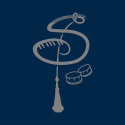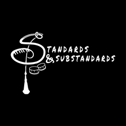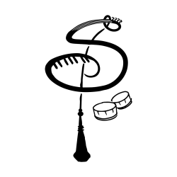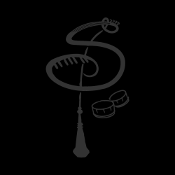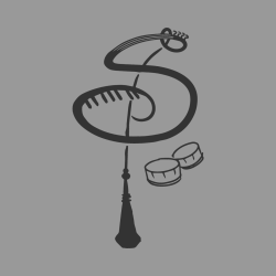 Our classic black logo featuring bass strings, piano keys, drums, and mic upon white for all of your formal attire needs. Also good for barbecues and house cleaning; and, as a special bonus, available on accessories such as stickers, magnets, cases, and bags.